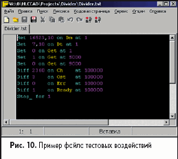 С помощью языка тестовых воздействий разработчик имеет возможность в нужный момент модельного времени указать тестовые воздействия, подаваемые на входы устройства, и эталонные значения для выходов. Файл теста представляется в виде текстовых команд.