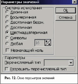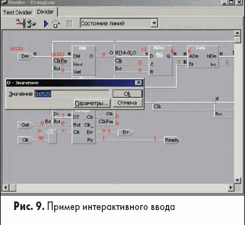 Отладчик отображает схемы моделируемых устройств и значения, установленные на контакты. Значения на контактах могут отображаться в произвольной системе счисления от 2 до 256 (рис.12). Для любого контакта можно установить перечисляемый тип, который позволяет задать список замен значений на текстовую строку. Разработчику доступны механизмы установки параметров значений для всех контактов определенного корпуса на схеме либо для всех контактов на схеме. Кроме этого, любое значение можно перенести в произвольное место на схеме.