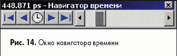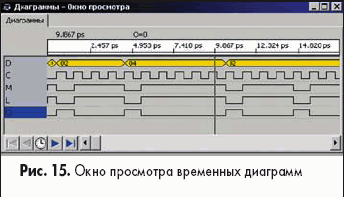 Окно временных диаграмм (рис.15) является традиционным для систем разработки аппаратного цифрового обеспечения. В левой части отображаются имена контактов, а в правой — трасса значений в виде диаграммы. Имеются возможности масштабирования, фильтрации и поиска значения. Средства навигации аналогичны окну «Навигатор времени».