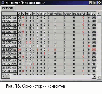Окно истории контактов (рис.16) отображает трассу значений в виде таблицы. Каждый столбец таблицы содержит значения контакта в момент модельного времени, определенного строкой. Каждая строка таблицы всегда отличается от предыдущей, то есть информация сжата.