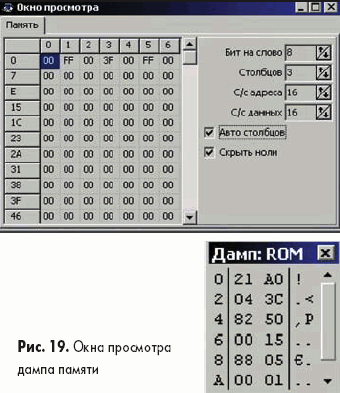 Просмотр содержимого дампа памяти осуществляется двумя способами (рис.19).Первое окно позволяет изменять настройки окна произвольным образом: изменять систему счисления адреса и данных, устанавливать произвольный размер слова памяти. Второе окно специфично при отладке программного обеспечения для МП или МК.