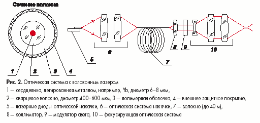 «Сердце» лазерных плоттеров, конечно же, сам лазер. От его характеристик, надежности и удобства в эксплуатации зависят многие технические данные всего оборудования. Многолетний опыт работы с технологией LaserGraver показывает, что наиболее оптимальны для ее реализации так называемые волоконные лазеры с полупроводниковой накачкой (активная среда иттербий, ИК-излучение, рис.2). Это чрезвычайно удобные и надежные источники, представляющие собой идеальные преобразователи световой энергии лазерных диодов оптической накачки в лазерное излучение. Они не требуют водяного охлаждения, не имеют сменных изнашиваемых компонентов и обладают рекордным среди лазеров подобного назначения КПД. Создание таких излучателей — результат многолетнего развития лазерной техники. С ними системы LaserGraver становятся практически офисной техникой, степень автоматизации и защищенность которой соответствуют современным европейским стандартам.