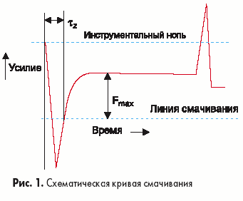 Тестирование паяемости проводилось методом весового смачивания в соответствии с ANSI/J-J-STD-003. Этот метод, как один из самых динамичных, позволяет наблюдать процесс смачивания поверхности расплавленным припоем в присутствии флюса. Образец, покрытый флюсом, взвешивается на чувствительных весах и опускается боком на установленные глубину и время в ванну с расплавленным припоем с контролируемой температурой. Результирующая сил выталкивания и поверхностного натяжения, действующих на образец, определяется с помощью датчика и преобразуется в сигнал, который непрерывно записывается как функция времени. Типичный вид процесса смачивания представлен на рис.1.