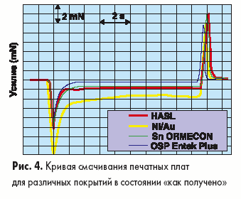 В состоянии «как получено » покрытия SN-Pb HASL, Sn Ormecon CSN и OSP Enthone Entek Plus имеют сравнимую паяемость, а Ni/Au характеризуется чуть меньшей паяемостью.