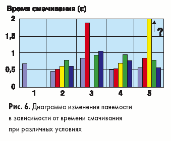 Примеры кривых смачивания образцов в состоянии «как получено » показаны на рис.4. Диаграммы на рис.5 (максимальная сила смачивания P max ) и рис.6 (время смачивания tz) иллюстрируют изменение паяемости при различных условиях.