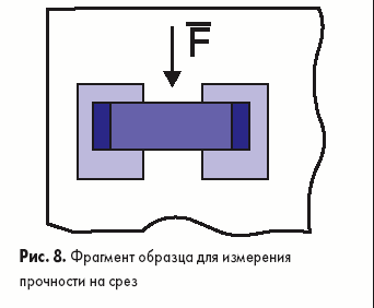 Паяные соединения электронного оборудования во время их эксплуатации подвергаются воздействию преимущественно сил «сдвига ». В нашем исследовании тестовое усилие сдвига было направлено на испытываемые платы (рис.8) в соответствии с IEC 68-2-21 и IEC 115-1. Контактные площадки были защищены исследуемыми покрытиями.