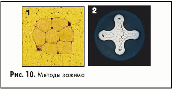 Для униполярных коннекторов применяется метод зажима — квадрат, для мультиполярных и экрана коаксиальных — крест (рис.10). Подобный метод требует контроля симметричности деформации контакта и провода. Радиальное отверстие со стороны контакта позволяет проверить корректность соединения.