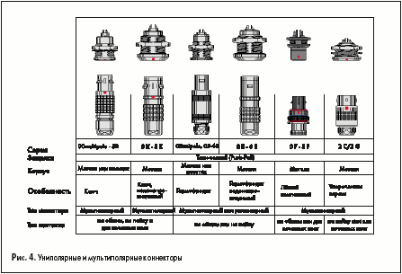 Фактически во всех вышеперечисленных областях используют униполярные и мультиполярные разъемы (рис.4). Фирма LEMO выпускает 40 серий униполярных и мультиполярных коннекторов, разделенных на семь групп, каждая из которых представляет собой широкое разнообразие гнезд и разъемов, совместимых с семейством кабелей до 106 жил и диаметром до 30 мм.