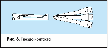 Надежное соединение контактов в разъеме Lemo обеспечивается в основном за счет двух особенностей дизайна гнезда контакта (рис.6):1) оно имеет корректирующий стыковку вход, который гарантирует идеальное соединение даже в случае небрежного направления штекера;2) зажимная пружина столь эластична, что не ослабевает после соединения, а рабочая сторона пружины предохраняется от стирания золотым покрытием.