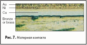 Контакты гнезда разъема Lemo (рис.6) изготавливаются из бронзы, а контакты штекера — из латуни. Рабочая поверхность обрабатывается медью (0,5 мкм), никелем (3 мкм) и золотом (1 мкм)(рис.7).