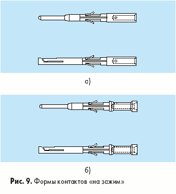 Контакты «на зажим » бывают двух форм (рис.9): а) стандартная — для большого диаметра провода; б) уменьшенная — для небольших диаметров.