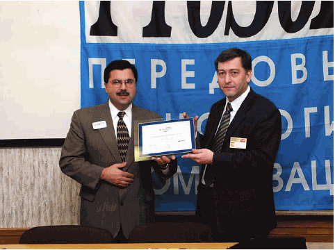 Как уже говорилось выше, выставка «Передовые технологии автоматизации » выросла из семинаров «Прософт », поэтому одним из главных событий ПТА-2002 стал двухдневный семинар,прошедший под девизом «От компонентов к решениям в АСУ ТП ». Он стал шестандцатым семинаром, организованным «Прософтом » с 1991 года. Слушателям были представлены компьютеры и серверы Advantech, встраиваемые компьютеры Octagon Systems и Fastwel (эти изделия предназначены для жестких условий эксплуатации), новые преобразователи от Siemens, средства контроля уровня Siemens Milltronics и другое оборудование,поставляемое на рынок .России и СНГ фирмой «Прософт ». Напомним, что в настоящее время «Прософт» представляет в России более 40 ведущих мировых компаний. Одна из них — американская Iconics, специалисты которой продемонстировали возможности новой 7.0 версии SCADA-пакета GENESIS32. Кстати говоря, в 2002 году «Прософт » был признан ключевым партнером Iconics и его лучшим дистрибьютором в Европе. Вице-президент Iconics по мировым продажам Кристофер Вольпе вручил на семинаре генеральному директору компании «Прософт » Сергею Сорокину соответствующий сертификат.