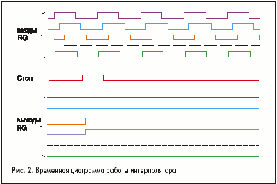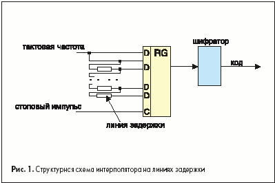 Импульсы тактовой частоты поступают на вход данных D регистра интерполятора. Эти же сигналы пропускаются через цепочку элементов задержки, с выходов которых они попадают на другие D-входы того же регистра. Таким образом, на них устанавливаются сдвинутые во времени импульсы тактовой частоты, которой тактируется основной счетчик времени. Появление импульса «Стоп » защелкнет данные в регистр. При этом на некоторых выходах будут присутствовать единицы, а на других — нули. С выходов регистра сигналы поступают на входы шифратора, например SN74ASL148 (приоритетный шифратор). В результате получается нормальный двоичный код, несущий уточняющую информацию о моменте прихода импульса «Стоп ». Точность определяется числом элементов задержки и ее длительностью. На какое число интервалов мы раздробим период тактовой частоты, какова будет продолжительность одного интервала, такова и точность.