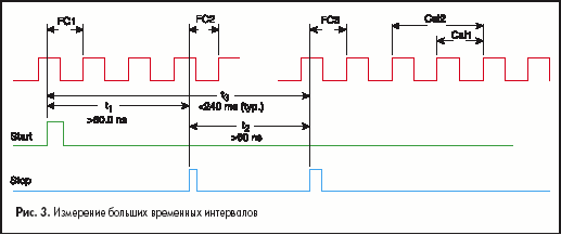 В таких случаях необходимо вводить в работу встроенный предварительный делитель частоты (предварительный счетчик) для того, чтобы перенести на него выполнение грубого измерения диапазона. С момента активизации измерительного процесса выполняется измерение интервала между импульсом «Старт » и следующим восходящим фронтом калибровочного тактового сигнала (FC1), после чего TDC типа GP1 приступает к подсчету импульсов переполнения предварительного счетчика. Стоповый импульс перезапускает (рестартует) процесс и происходит измерение интервала до следующего калибрационного тактового сигнала (FC2). (Как в первом, так и во втором случае это делается для калибровки узлов микросхемы.) GP1 способен работать с 16-битовым предварительным счетчиком. При этом возможно измерение больших (до 200 мс) интервалов без снижения разрешающей способности TDC (см.рис.3). Результат вычисляется по формуле