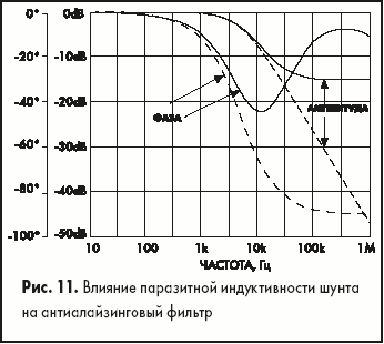Данный метод компенсации хорошо работает, если полюс, возникающий из-за наличия паразитной индуктивности у шунта, находится на частоте не выше приблизительно 25 кГц. Если нуль характеристики находится на гораздо более высокой частоте, его влияние может быть устранено просто добавлением дополнительной RC-цепочки в канале V1 с полюсом, располагающимся гораздо выше, чем полюс антиалайзингового фильтра, например, RC-цепочки 100 Ом и 0,033 мкФ.