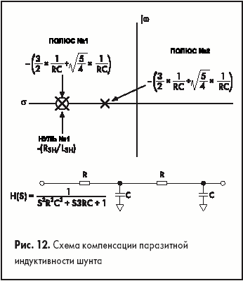 При выборе шунта нужно руководствоваться требованием, чтобы его паразитная индуктивность была минимальна. Это особенно важно для шунтов с низким сопротивлением, ниже чем приблизительно 200 мкОм. Обратите внимание, что чем меньше сопротивление шунта, тем ниже частота, на которой располагается нуль характеристики при данной паразитной индуктивности (Нуль =R SH1 /L SH1 ).