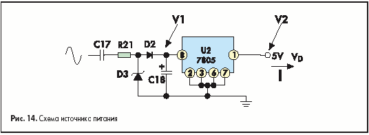 В данном счетчике используется простой недорогой источник питания, основанный на емкостном делителе на конденсаторах С17 и С18. Бoльшая часть сетевого напряжения падает на конденсаторе С17, пленочном металлизированном полиэстеровом конденсаторе емкостью 0,47 мкФ на 250 В. Импеданс конденсатора С17 обеспечивает эффективную работу источника питания. В то же время величина конденсатора С17 соответствует требованиям стандарта IEC1036 по потребляемой мощности. Суммарная потребляемая мощность в цепи напряжения,включая источник питания, определяется в разделе 4.4.1.1 стандарта IEC1036 (1996-9). Общая потребляемая мощность не должна превышать в номинальном режиме 2 Вт и 10 В ·А. Номинальное значение потребляемой мощности в данной конструкции составляет 7 В ·А, при этом активная мощность, потребляемая источником питания, составляет 0,5 Вт. Вместе с мощностью, рассеиваемой на шунте при токе 40 А, суммарная потребляемая мощность счетчика составит 1,06 Вт. На рис.14 показана схема источника питания.