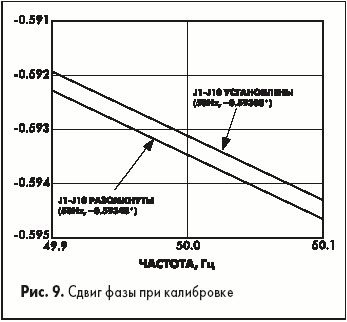 Обратите внимание, что по этой же причине были приняты соответствующие меры при разработке цепи калибровки в канале V2 (канале напряжения). Калибровка данного счетчика путем подбора сопротивления цепи делителя не влияет на значение частоты среза, а значит, и на фазо-частотную характеристику цепи канала V2 (см.раздел «Калибровка счетчика »). На графике рис.9 показаны положения фазо-частотной характеристики схемы при изменении сопротивления цепи калибровки от 660 кОм (когда перемычки J1 –J10 установлены) до 1,26 МОм (когда эти перемычки удалены).