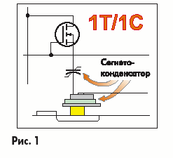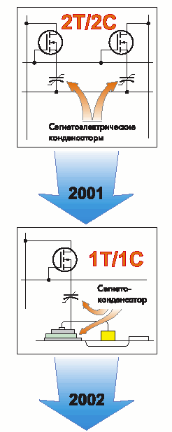 Первое — переход на запоминающий элемент, выполненный на базе однотранзисторной ячейки памяти 1Т/1С (рис.1). Первое в мире коммерческое изделие, выполненное по технологии 1T/1С (прибор FM24C256), было представлено на рынок в 2001 году. Ранее при производстве FRAM-приборов использовалась двухтранзисторная ячейка памяти 2T/2С. Переход на технологическую ячейку с одним транзистором и одним конденсатором позволил существенно сократить площадь кристалла, необходимую для размещения запоминающего элемента.