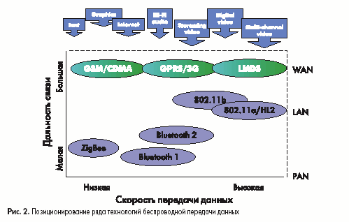 Обычно коллизия между потребителем и производителем выглядела примерно так: мне нужно это, а с другой стороны звучало — а я могу это. Сейчас картина выглядит с точностью до наоборот (если не считать вечных природных и временных технологических ограничений). Движение со стороны потребителя очевидно — больше и недорого. Но что нужно? Здесь два варианта — работа и быт. Причем оба варианта не чужды друг другу. Итак, следующий вопрос — что нужно для работы? Ответ — нужно все. Где система, там и люди. Посмотрим, что могут предложить нам существующие технологии и компоненты. Для ориентации используем рис.2, на котором изображено примерное позиционирование ряда технологий беспроводной передачи данных в координатах «дальность связи — скорость передачи ».