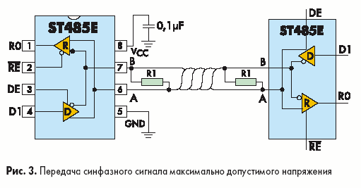 - При передаче данных по витой паре на прохождение сигнала в линии влияет много факторов, например, импульсные помехи и наведенные токи. При дифференциальной передаче те же самые факторы создают помехи на входах А и В (рис.3), так что различий здесь нет, но все синфазные составляющие помех на входе приемника при этом взаимно компенсируются.