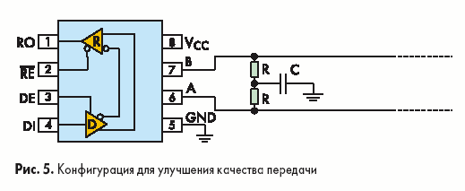 Для получения большей длины кабеля, более высокой скорости передачи данных и улучшения качества сигнала существуют определенные рекомендации. Например, подключение нагрузки в соответствии с рис.5 позволяет осуществлять фильтрацию V CM и тем самым уменьшать уровень синфазных помех. Значения R =Rн/2, а в качестве емкости С используют керамический (или полиэфирный) конденсатор на 0,1 нФ.