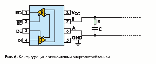 Применение стандартного согласующего сопротивления часто приводит к увеличению потребления тока, поэтому для его минимизации в статических состояниях может быть полезна конфигурация согласно рис.6. Значение R зависит от импеданса линии, обычно это — 120 Ом для неэкранированной витой пары; величина C зависит от длины кабеля или от импеданса Zо линии и его значение рассчитывается. Емкость C фильтра нижних частот разрывает цепь контурного тока при отсутствии передачи, что уменьшает энергопотребление, но ограничивает скорость передачи данных, поэтому данную конфигурацию можно использовать на средних скоростях передачи данных.