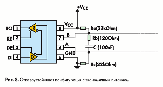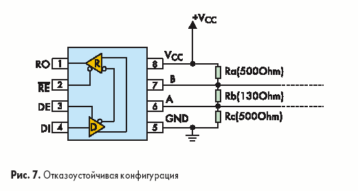 Однако внутренняя отказоустойчивая резистивная схема находится под влиянием внешней оконечной нагрузки (54 или 120 Ом) и часто требуются дополнительные меры по согласованию. Типичная отказоустойчивая оконечная конфигурация показана на рис.7. Резисторы Ra (повышает напряжение) и Rc (понижает напряжение) должны быть по 500 Ом, а резистор Rb (нагрузочный) — 130 Ом.