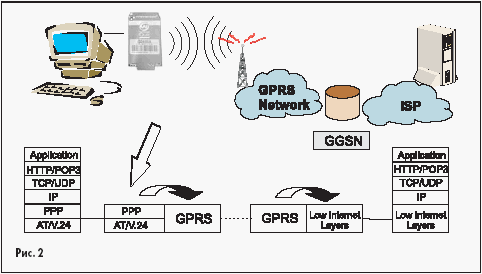 Упрощенная схема передачи данных через Интернет в режиме GPRS показана на рис. 2.