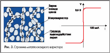 Металлооксидный варистор (рис. 3) состоит из множества зерен оксида металла (например, цинка), помещенных в не проводящий ток материал. Сопротивление варистора сильно зависит от приложенного к нему напряжения: при увеличении напряжения ток через варистор начинает резко возрастать. Вольт-амперная характеристика (ВАХ) варистора показана на рис. 3 и 4. У зерен оксида цинка электрическая проводимость высокая. Под действием приложенного к варистору напряжения зерна начинают выстраиваться в «цепочки», при этом соприкасаясь между собой, вследствие чего сопротивление варистора резко снижается. Как правило, чем больше толщина диска варистора, тем большее напряжение на него можно подавать, а чем больше диаметр диска варистора, тем большие токи он способен выдерживать. Предельное напряжение варистора определяется его номинальным напряжением и устойчивостью к току. При высоком сопротивлении ток утечки варистора составляет несколько миллиампер. При низком сопротивлении через варистор может течь ток в несколько ампер, а в течение короткого времени — и килоампер.