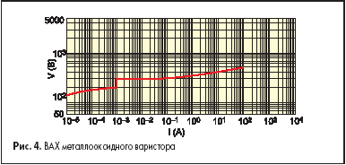 Максимальное напряжение варистора для заданного тока на участке ВАХ выше напряжения срабатывания варистора может быть определено непосредственно по ВАХ варистора (рис. 4). При очень высоких токах работа варистора зависит только от протекающего через него тока, так как сопротивлением границ зерен оксида цинка можно пренебречь.