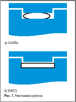В качестве первого сравнения — заявляемая герметичность. Если у GAINTA это IP65, то у ENSTO — IP66/67. Как это обеспечивается? Просто все дело в материале уплотнителя. GAINTA в лабиринтную канавку крышки предлагает уложить шнур из пористого каучука (рис. 1), при этом прилив на корпусе, повторяя конфигурацию канавки крышки, заходит туда, сжимая шнур. Неплотности лабиринта, заполненные сжатым шнуром и обеспечивают герметичность. Правда, если спустя некоторое время придется крышку снять, нет уверенности, что герметичность останется IP65, скорее это будет IP64. Компания ENSTO к вопросу герметичности подошла более серьезно. Там уплотнение обеспечивается тоже лабиринтным стыком крышки и корпуса, только в канавке залита пластичная силиконовая масса, которая не теряет своих свойств даже в мороз и более стабильна во времени. Поэтому как-то больше верится, что через год и через два в таком корпусе можно делать ревизию, и защита будет не хуже IP65.