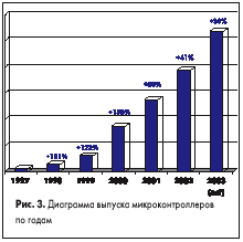 С момента начала производства в 1997 году ежегодный объем выпуска AVR-микроконтроллеров неуклонно увеличивается. На рис.3 представлены соответствующие показатели. Для справки: в 2002 году было выпущено более 100 миллионов микросхем.