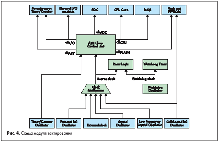 Из приведенной схемы видно, что внутри кристалла используется несколько цепей тактирования. Такое построение позволяет при необходимости отключать неиспользуемые цепи, что снижает потребляемый микросхемой ток.