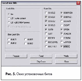 Выбор способа тактирования производится установкой соответствующих установочных битов (fuse bits)CKSEL0...CKSEL3 при программировании микросхемы. Эти установочные биты управляют также задержкой включения микроконтроллера после выхода из состояния ожидания. В таблице 2 приведены варианты установок этих битов.