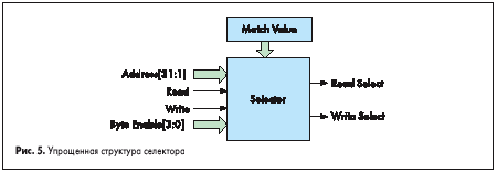 Механизм адресных селекторов предназначен для обеспечения доступа к массиву программируемой логики со стороны процессора или контроллера DMA без использования ресурсов собственно встроенной матрицы программируемой логики. Селектор (рис.5) представляет собой гибкую аппаратную схему сравнения адреса в диапазоне 4 Гбайт с числом, характеризующим этом ресурс (Match Value), с учетом выравнивания (Byte Enable [3:0 ])и направления доступа (чтение или запись). В результате настройки определяется его адрес, который характеризует программно-доступный ресурс и будет использоваться при разработке математического обеспечения разрабатываемого приложения. Выходными сигналами селектора являются сигнал разрешения установки данных на шину со стороны массива программируемой логики (сигнал чтения) и сигнал стробирования для ввода данных с шины в массив программируемой логики (сигнал записи). Обычно такая транзакция проходит за один период тактовой частоты, но если устройство работает асинхронно, то имеется механизм ожидания готовности устройства, что весьма удобно для подключения приборов, не имеющих высокого быстродействия. Кроме того, селекторы имеют специальный режим поддержки DMA.
