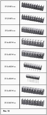 - Однорядные — клеммы располагаются в один ряд (рис.1).Выпускаются как с крышками,закрывающими винты,так и без них — DT-25-B01x-xx, DT-25-B07x-xx, DT-2x-B01x-xx, DT-4x-B01W-xx, DT-5x-B01W-xx, DT-5x-B03W-xx, DT-5x-B06W-xx, DT-5x-B81W-xx, DT-55-B01W-xx (рис.10).