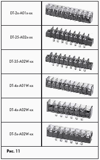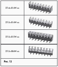Есть модификации,которые предназначены для установки на плату, причем винты развернуты относительно выводов на 90 ° таким образом, что оси клеммных винтов располагаются параллельно плоскости платы, позволяя закрепить плату в корпусе так, чтобы винтовые зажимы выходили наружу через прорезь корпуса, образуя выводы устройства. Выпускаются с крышками и без них — DT-4x-B14W-xx, DT-5x-B14W-xx, DT-5x-B15W-xx, DT-5x-B84W-xx (рис.12).