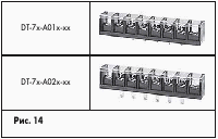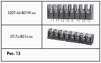 - Сильноточные — клеммы располагаются в один ряд.Выпускаются как с крышками, закрывающими винты,так и без них — DT-66-B01W-xx, DT-7x-B01x-xx (рис.13).