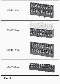 - Двухрядные — клеммы располагаются в два ряда (рис.4).Выпускаются как с крышками, закрывающими винты,так и без них — 2DD-B01W-xx, 2Dx-B01W-xx, 4DN-B01W-xx, 4DSCC-01-xx (рис.9).