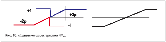 В современных ЧФД приняты меры,обеспечивающие качественную «сшивку » двух пол - вин пилообразной характеристики (рис.10). При этом нелинейность характеристики в окрестностях нулевой точки практически отсутствует — из-за введения логической схемы сброса и выравнивания задержек — anti-back-lash pulse width (так называемые малошумящие ЧФД).