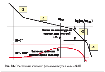 Основной задачей петлевого ФНЧ является дополнительная фильтрация помех с частотами, кратными частоте сравнения. Кроме того важной функцией петлевого фильтра является обеспечение требуемой АЧХ кoльца и егo безусловной устойчивости — рис.13 [2 ].