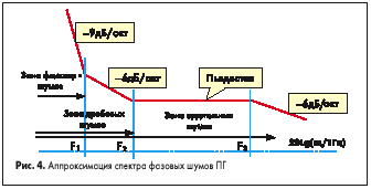 В качестве иллюстрации в таблице 1 приведены уровни фазовых шумов на выходе опорного кварцевого генератора (ОКГ) фирмы «Морион » ГК54--ТС на частоте 10 МГц; те же шумы, пересчитанные на частоту 1600 МГц, и фазовые шумы LC ГУН ROS-1700W фирмы MiniCircuits.