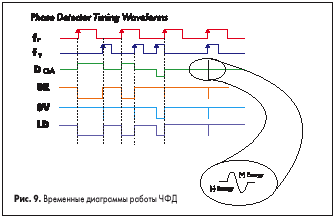 На рис.8 приведены временные диаграммы работы ЧФД при различных сочетаниях прихода одноименных фронтов импульсов опорного f r (первая строка) и приведенного f p (вторая строка)колебаний. Третья строка показывает форму сигнала на выходе детектора контроля синхронизма LD (Lock Detect).