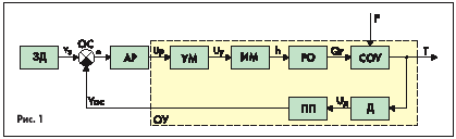 Переменные: Yз — задающий сигнал, e — ошибка регулирования, U P — выходной сигнал регулятора, U y — управляющее напряжение, h — перемещение регулирующего органа, Q r — расход вещества или энергии, F — возмущающее воздействие, T — регулируемый параметр, Y ОС — сигнал обратной связи (выходное напряжение или ток преобразователя).