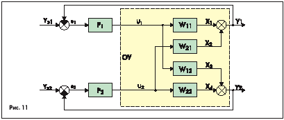Из общего числа систем регулирования около 15% составляют двухсвязные системы регулирования (рис.11). В таких системах даже при наличии устойчивой автономной работы двух регуляторов вся система может стать неустойчивой за счет действия перекрестной связи в объекте управления.