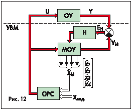 Структурная схема оптимального регулятора состояния, содержащего наблюдающее устройство, приведена на рис.12. Схема содержит следующие элементы: Н — наблюдатель, ОУ — объект управления, МОУ — модуль объекта управления, ОРС — оптимальный регулятор состояния, Е Н — ошибка наблюдения, X М — вектор состояния модели, X зад.— вектор задания, U — вектор входа ОУ, Y — вектор выхода ОУ, Y М — вектор выхода модели.