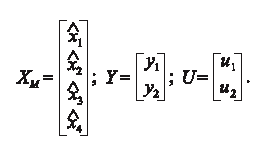 Объект управления в двухсвязной системе представлен в Р-канонической форме. Удобство такого представления заключается в том, что путем активного эксперимента можно определить все передаточные функции по соответствующим каналам. Промежуточные сигналы x 1 , x 2 , x 3 , x 4 обычно недоступны для измерения, поэтому управление ведется по вектору выхода Y: