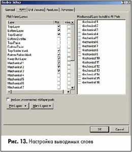 Здесь в списке Plot/Mirror Layers необходимо выбрать слои,которые будут выведены в Gerber-файлы. Каждый слой выводится в отдельный файл с именем, совпадающим с именем чертежа платы, и уникальным расширением. Таблица соответствия слоев будет приведена в итоговом отчете. В некоторых случаях требуется добавить к каждому слою служебную графическую информацию, приведенную на механических слоях, например, реперные символы. Для этого предназначен список Mechanical Layers to Add to All Plots (механические слои, добавляемые ко всем файлам).