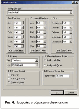 Настройки по умолчанию для данной распечатки включают лишь вывод содержимого всех сигнальных и служебных слоев, в том числе чертеж разметки отверстий сверления Drill Guide и чертеж с условными обозначениями отверстий разного диаметра Drill Drawing. Если эти настройки нас не устраивают, их можно быстро изменить здесь же.